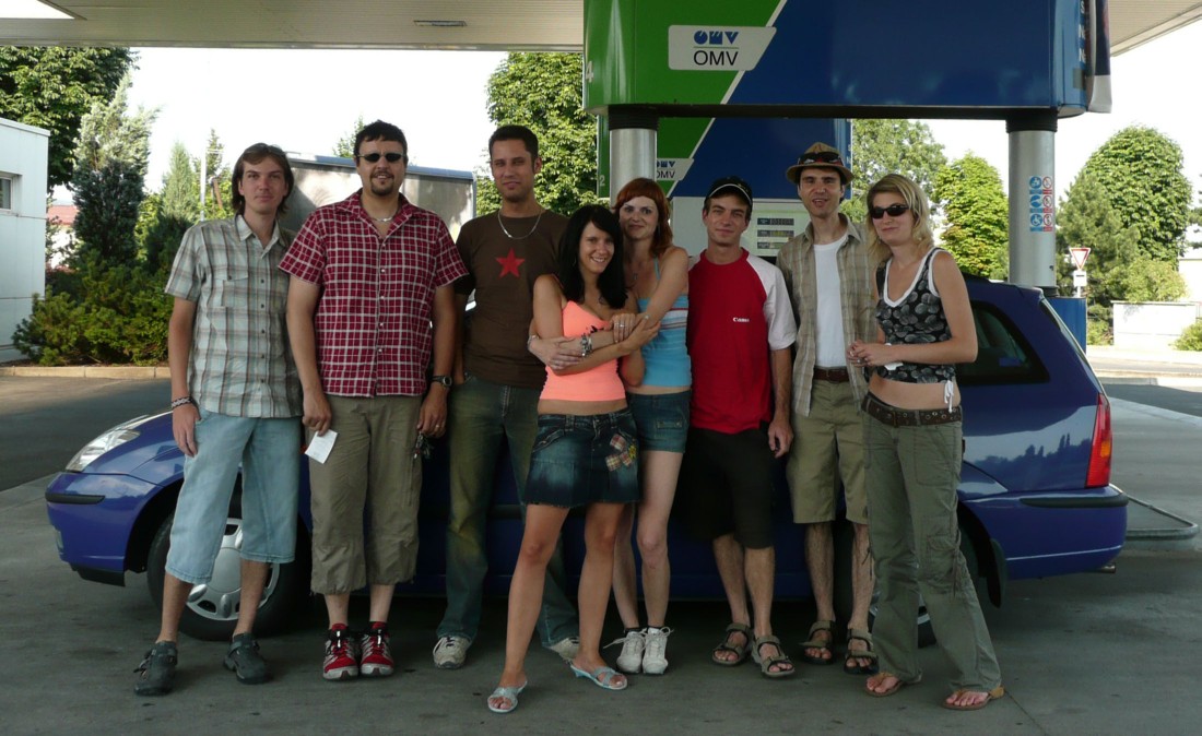Zleva: čumák auta, Martin, Ondra, Honza, Iva, Lucka, Jirka, Pavel a Martina, zadek auta